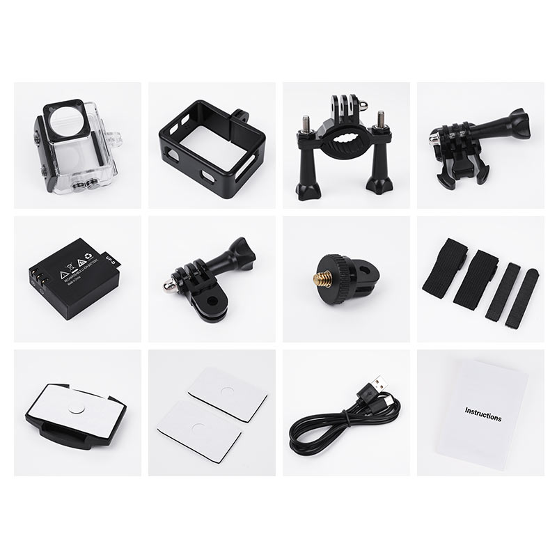 11. Accessories: waterproof shell, waterproof shell base, rear frame, bicycle holder, helmet holder, holder, adapter, Velcro + strap, 3M stickers, cable, battery.