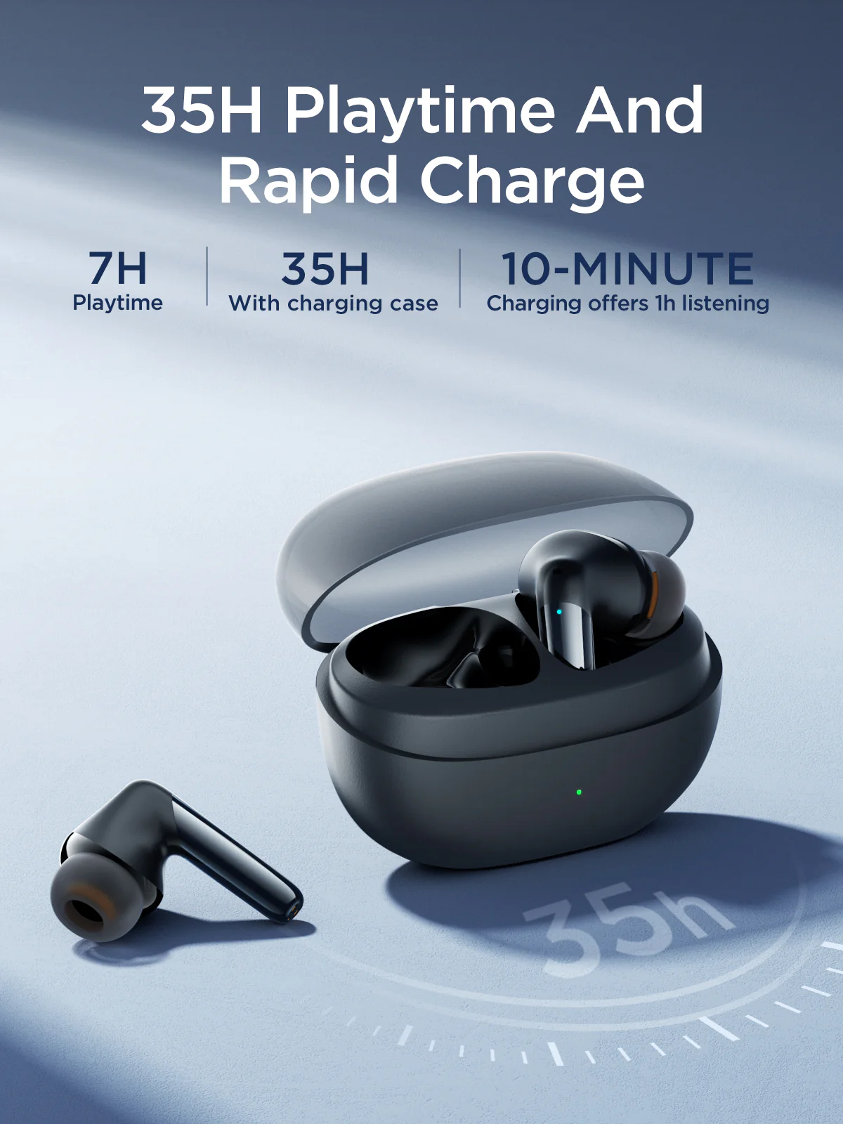 2. Built-in low consumption chip, up to 35h total listening time with the charging case